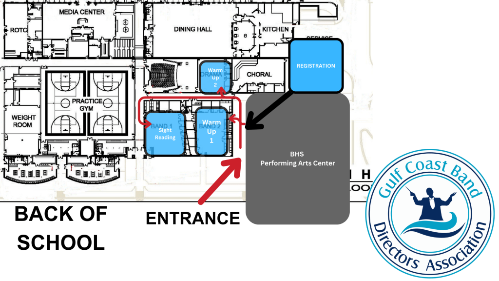 - Unload your buses and follow the sidewalk into warm-up rooms (see map). There will be a GCBDA staff member in the BPAC hallway entrance that will take your judge’s scores and seating diagram and guide you to your warm up area.